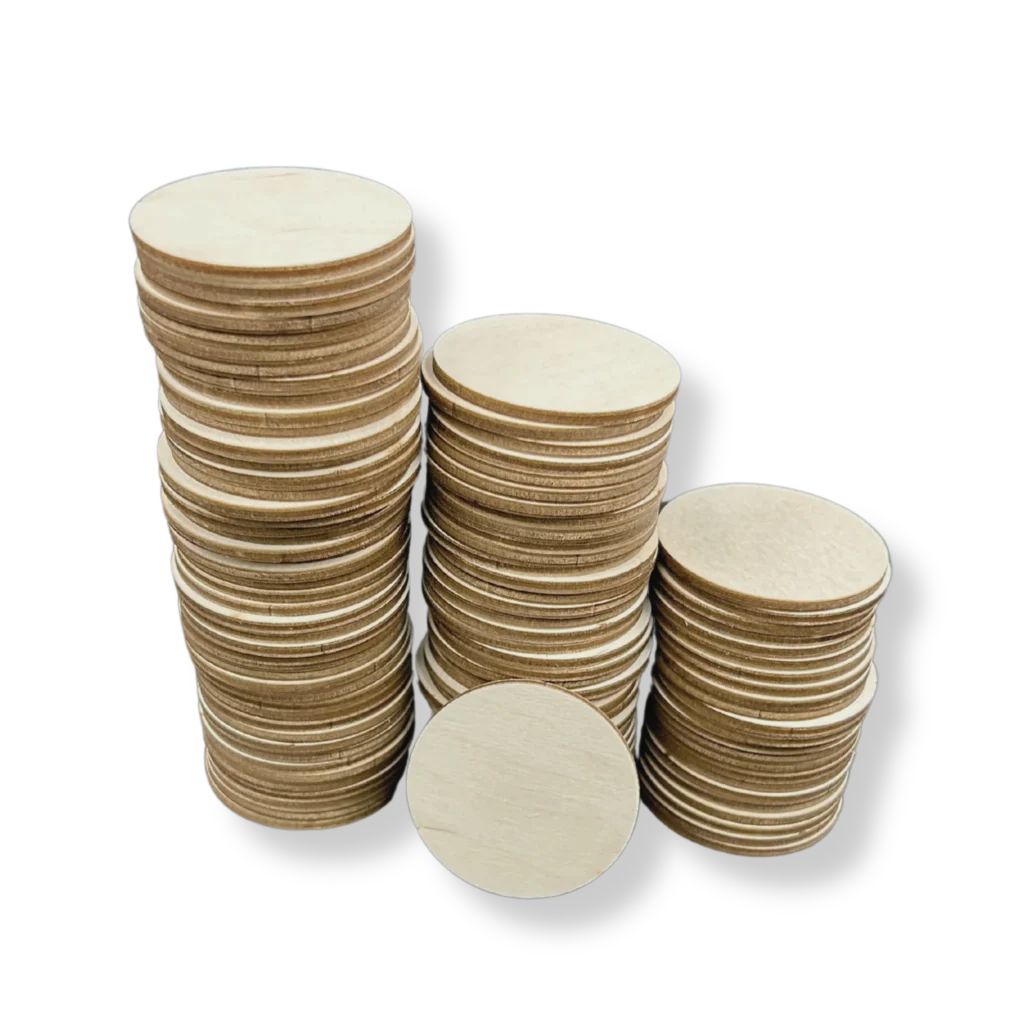 Zestaw kółek ze sklejki wysokiej klasy, ciętej laserowo. Kółka są naturalne i ekologiczne.